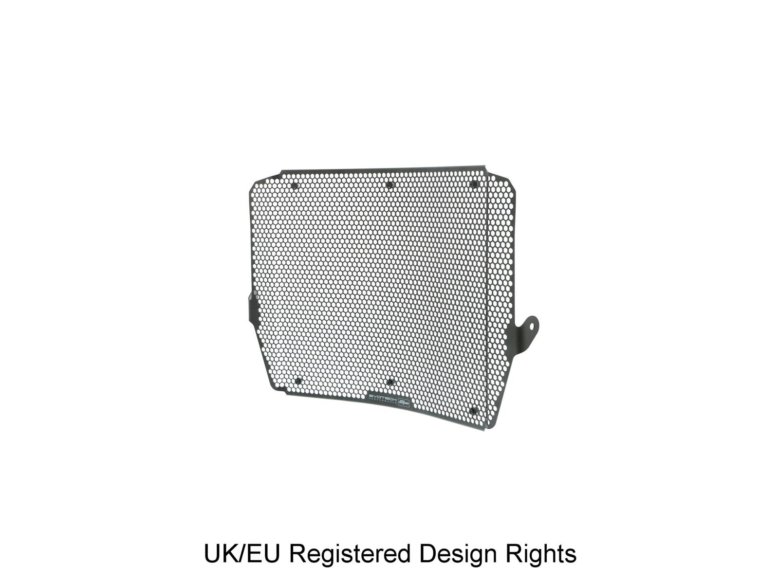 Simply put, an EP Radiator Guard protects the Triumph Street Triple RS radiator from damage caused by road debris (stones, mud, dropped waste etc), while at the same time allowing cool air to pass through. The radiator's thin, soft aluminium cooling fins easily bend, and misaligned fins can restrict cooling air, which can lead to overheating. The radiator's internal core is also susceptible to being holed by stones that can be picked up by the front tyre or other traffic and flung directly into the radiator. Leaking coolant will make the Triumph Street Triple RS overheat, which, in turn, can lead to engine damage.