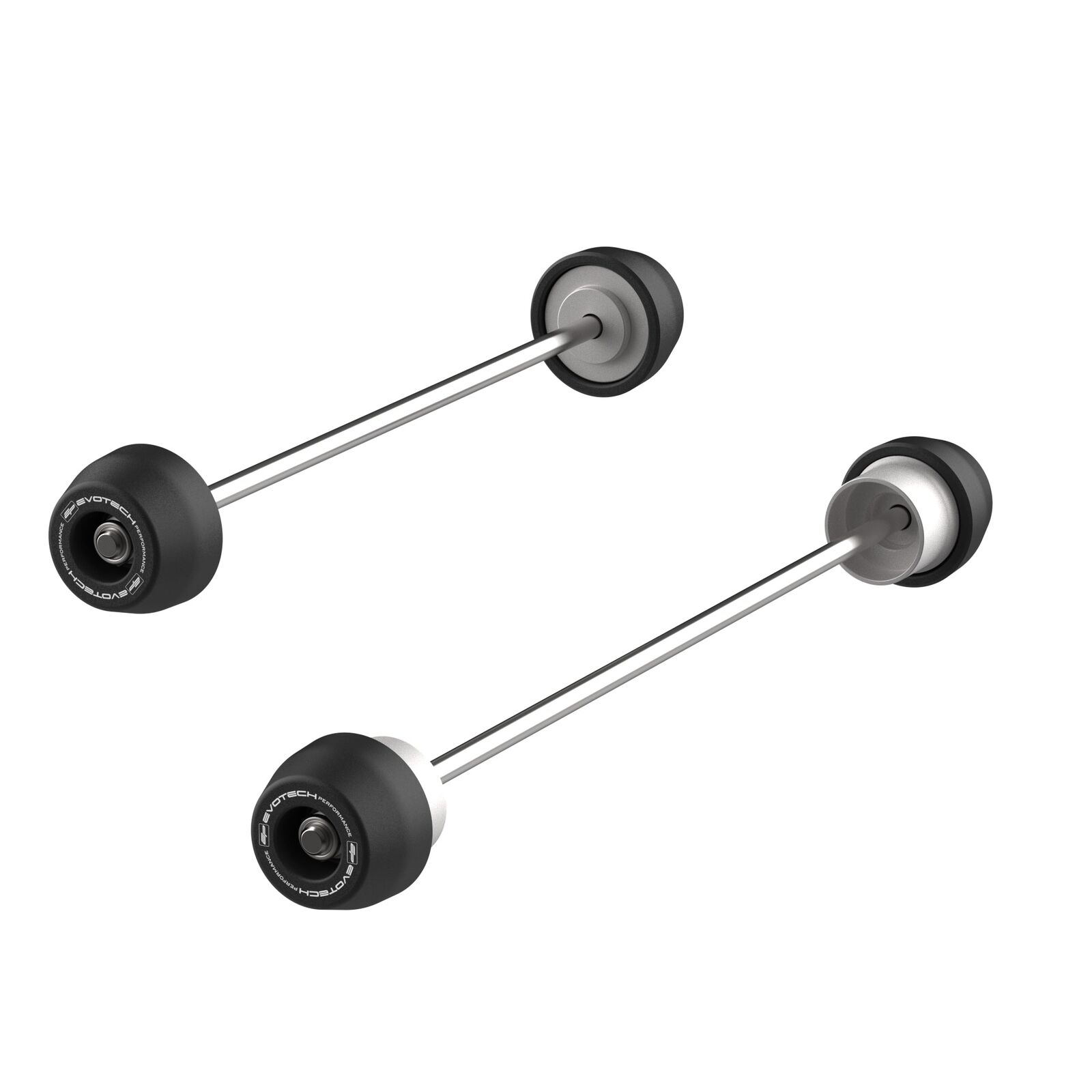Fitted through the front and rear wheel spindles, the nylon bobbins and aluminium support of Evotech Spindle Bobbins Kit for the Triumph Trident are designed to protect the front forks, brake calipers, and swingarm. The bobbins protrude from each side of the wheel, hoping to take impact first, should an incident occur, aiming to reduce expensive damage. The bobbins are reinforced with an aluminium core, designed and machined to precisely fit each wheel.